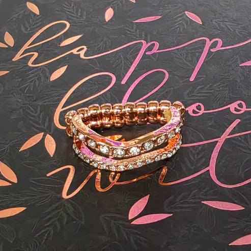 Varying in size, glittery white rhinestones are encrusted along waving copper bands for a refined look. Features a dainty stretchy band for a flexible fit.